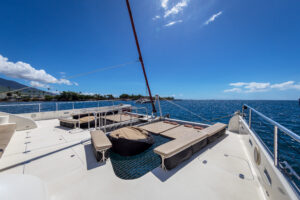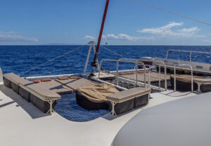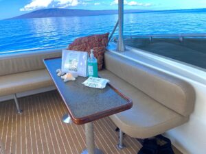 Welcome to Hula Girl – Maui’s finest day charter Yacht. It would be our pleasure to have you join us on Hawaii’s only catamaran with a fully licensed restaurant onboard. Hula Girl features a spacious air-conditioned Main Salon with cathedral ceilings, 8 granite & teak tables and couch style seating for up to 42 guests for sit down dining service. The third deck on the fly bridge features covered couch style seating with panoramic views, seating for 12 guests with 2 granite & teak tables for dining. While sailing on the trade winds or resting at anchor you can enjoy the fore deck and sunbathe on the 4 queen sized mattresses with throw pillows, cuddle up on the oversized bean bags attached to the trampoline, or relax on the plush couch seating in front of the mast. Our professional staff consists of Captains, Chefs, Bartenders, Waitstaff, Scuba Instructors and Deckhands who look forward to providing you with excellent service serving you plated Pacific Rim style cuisine on our custom logo chinaware, top shelf drinks with tropical blended cocktails, fine wines, Champagne, Hawaiian and Imported Beers, True Sailing, Scuba Diving Program on Snorkel excursions and Informal Whale Narration during Whale Season.